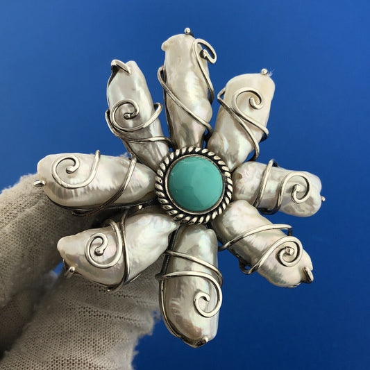 Designer 925 Sterling Silver CFJ Turquoise & Baroque Pearl Flower Floral Ring