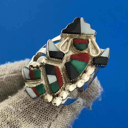 Vintage Native American Unsigned Sterling Silver Multi Stone Inlay Kachina Ring