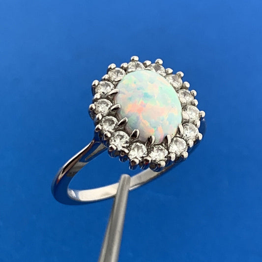 Designer 925 Sterling Silver Opal Cabochon Cubic Zirconia CZ Halo Cocktail Ring