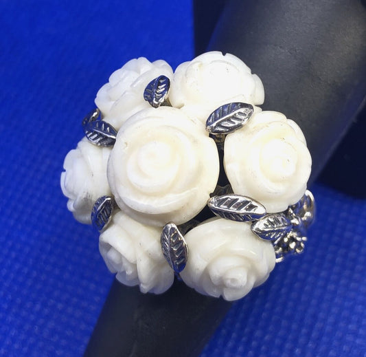 Designer SX 925 Sterling Silver Carved White Resin Rose Bouquet Cocktail Ring