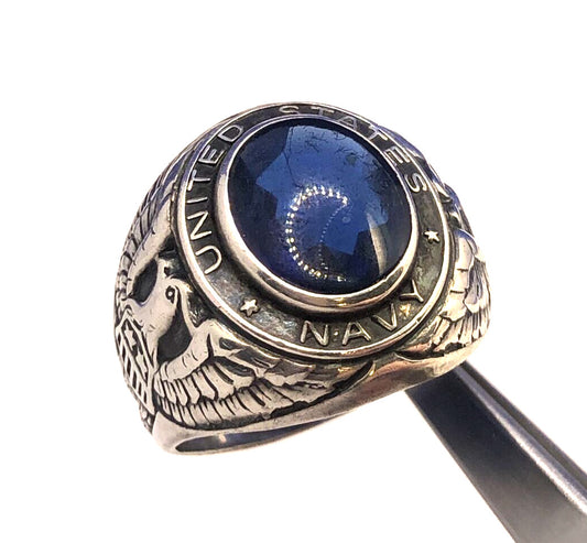 Designer Sterling Silver Oval Blue Glass United States Navy Insignia Dome Ring