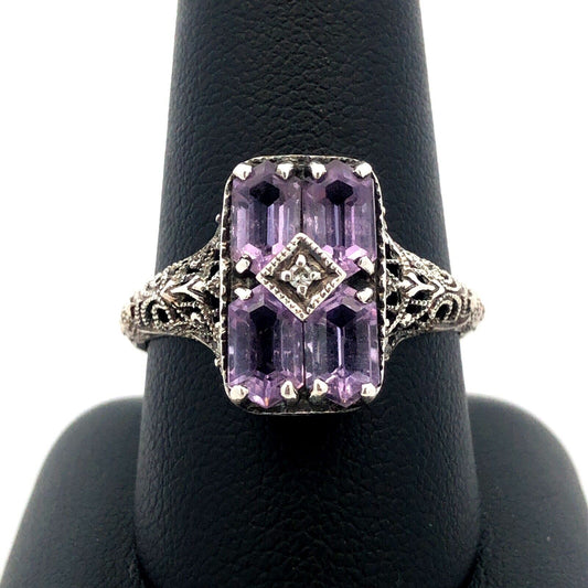 Designer CNA 925 Sterling Silver Amethyst Diamond Filigree Detail Rectangle Ring