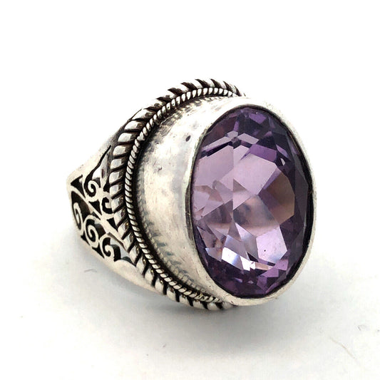 Vintage 925 Sterling Silver Oval Amethyst Floral Scroll Statement Ring