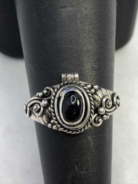 Vintage 925 Sterling Silver Oval Black Onyx Scroll Snuff Pill Box Size 6.5 Ring