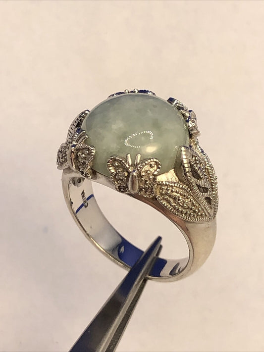 Designer EA 925 Sterling Silver Round Jade Diamond Accents Butterfly Detail Ring
