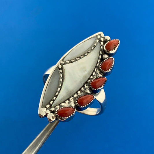Stunning Sterling Silver 925 Mother of Pearl Coral Accent Finger Ring Size 7.25