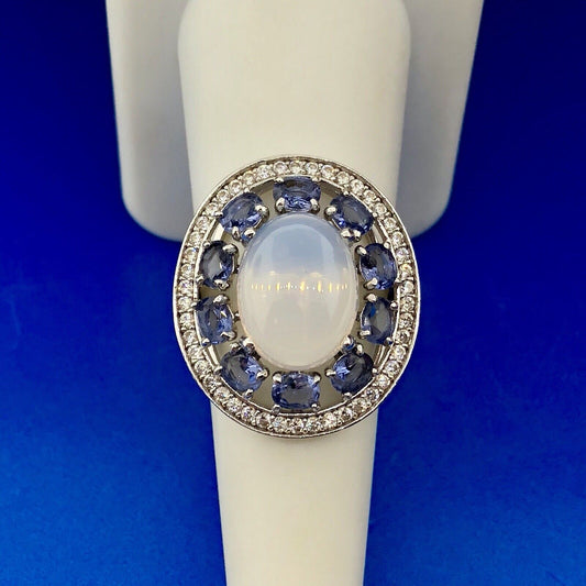 925 Sterling Silver Moonstone Tanzanite Diamond Double Halo Statement Ring