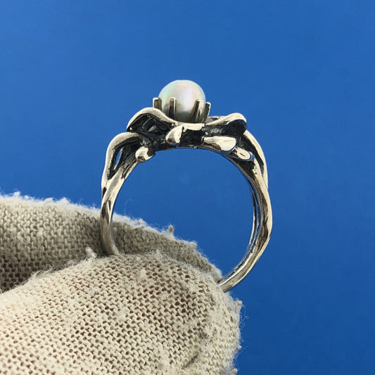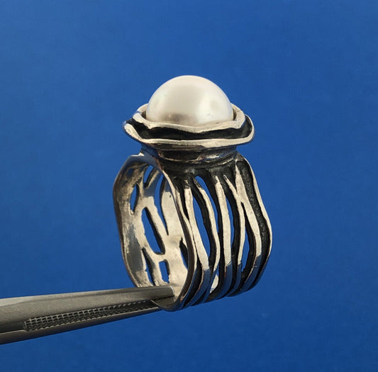 Modernist Artisan 925 Sterling Silver Pearl Free Form Open Work Ring
