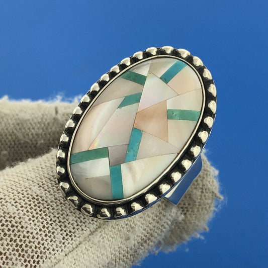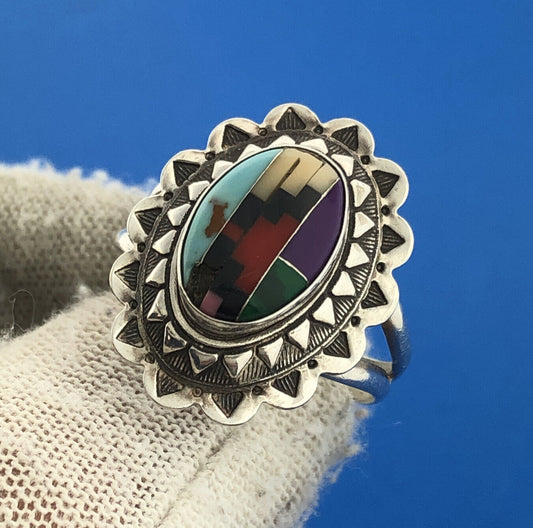 Native American Signed R.B. 925 Sterling Silver Mixed Gemstone Inlay Concho Ring