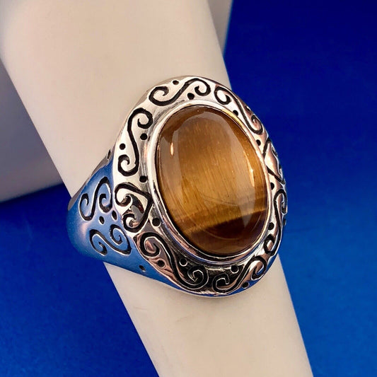 Designer 925 Sterling Silver Tiger Eye Cabochon Heart Scroll Concho Style Ring
