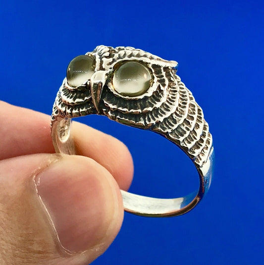 Artisan Sterling Silver Mens Moonstone Owl Textured Wisdom Prophecy Dome Ring