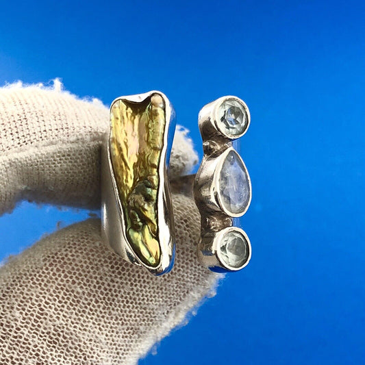 Stunning Sterling Silver 925 Abalone Shell Blue Topaz Moonstone Ring Size 7.5-9