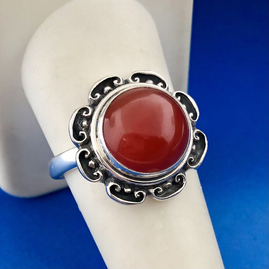 Retro 925 Sterling Silver Carnelian Cabochon Gemstone Flower Shaped Ring