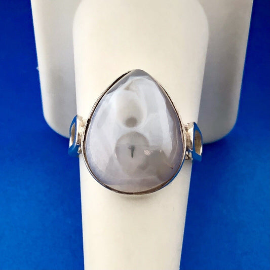 Retro 925 Sterling Silver Pear Cabochon Banded White Gray Agate Statement Ring