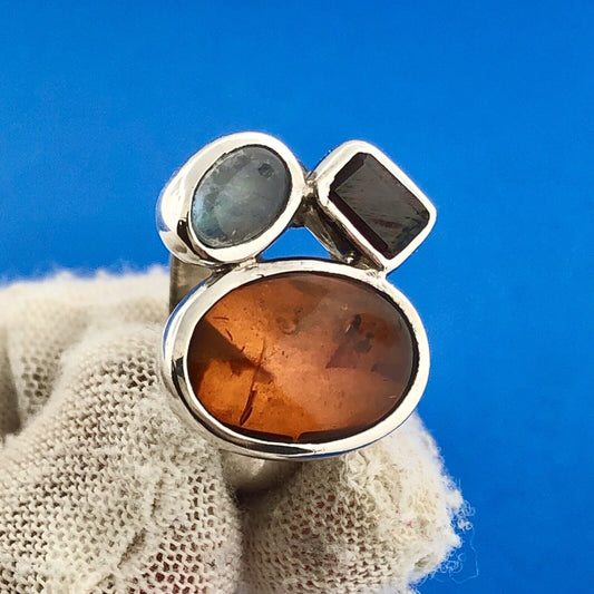 Gorgeous Modernist Sterling Silver 925 Amber Garnet Moonstone Ring Size 7.75