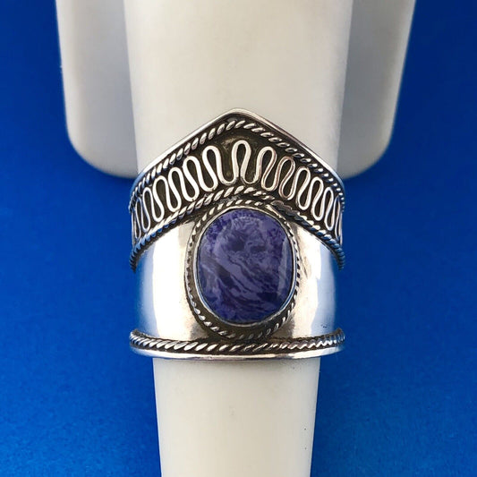 Stunning Sterling Silver 925 Oval Cabochon Swirly Purple Stone Ring Size 7