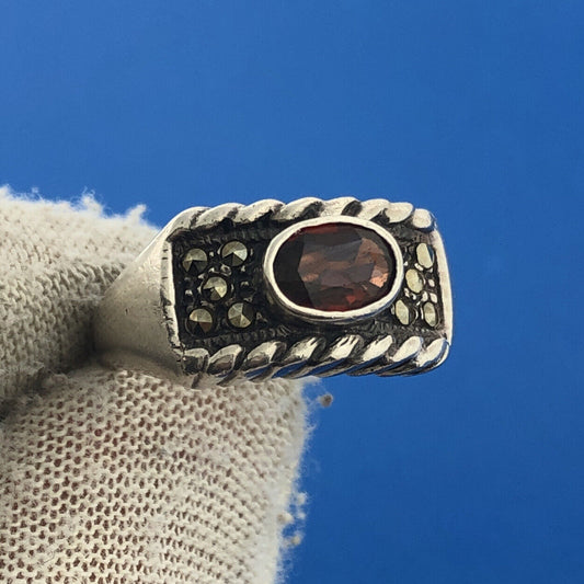 Designer NF 925 Sterling Silver Oval Garnet Marcasite January Birthstone Ring