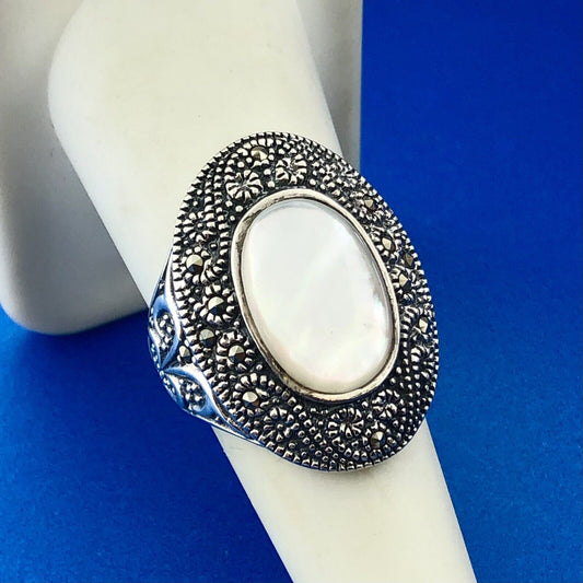 Stunning Sterling Silver 925 Mother of Pearl Marcasite Finger Ring Size 6.75
