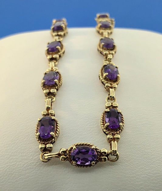 Vintage 10K Yellow Gold Oval Amethyst Panel February Anniversary Tennis Bracelet
