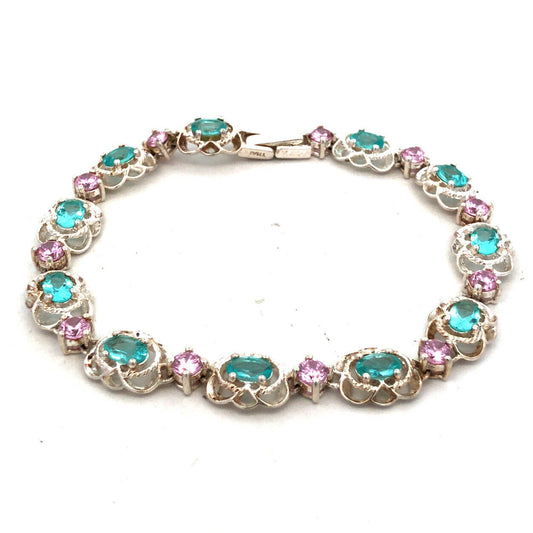 Designer HAN 925 Sterling Silver Oval Blue CZ Round Pink CZ Tennis Bracelet