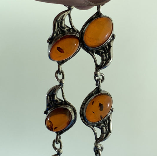 Vintage 925 Sterling Silver Oval Amber Cabochon Station Tennis Bracelet