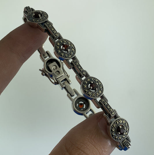 Designer PD 925 Sterling Silver Garnet Marcasite Vintage Tennis Bracelet