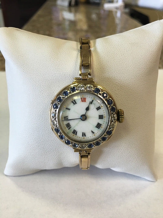 Ladies Vintage Victorian 14K Yellow Gold Diamond Sapphire Watch Adjusting Band