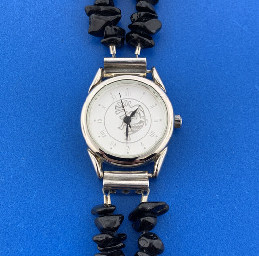 Kokopelli Dancing Flute Player 8" Black Shard Stainless Steel Wristwatch Running