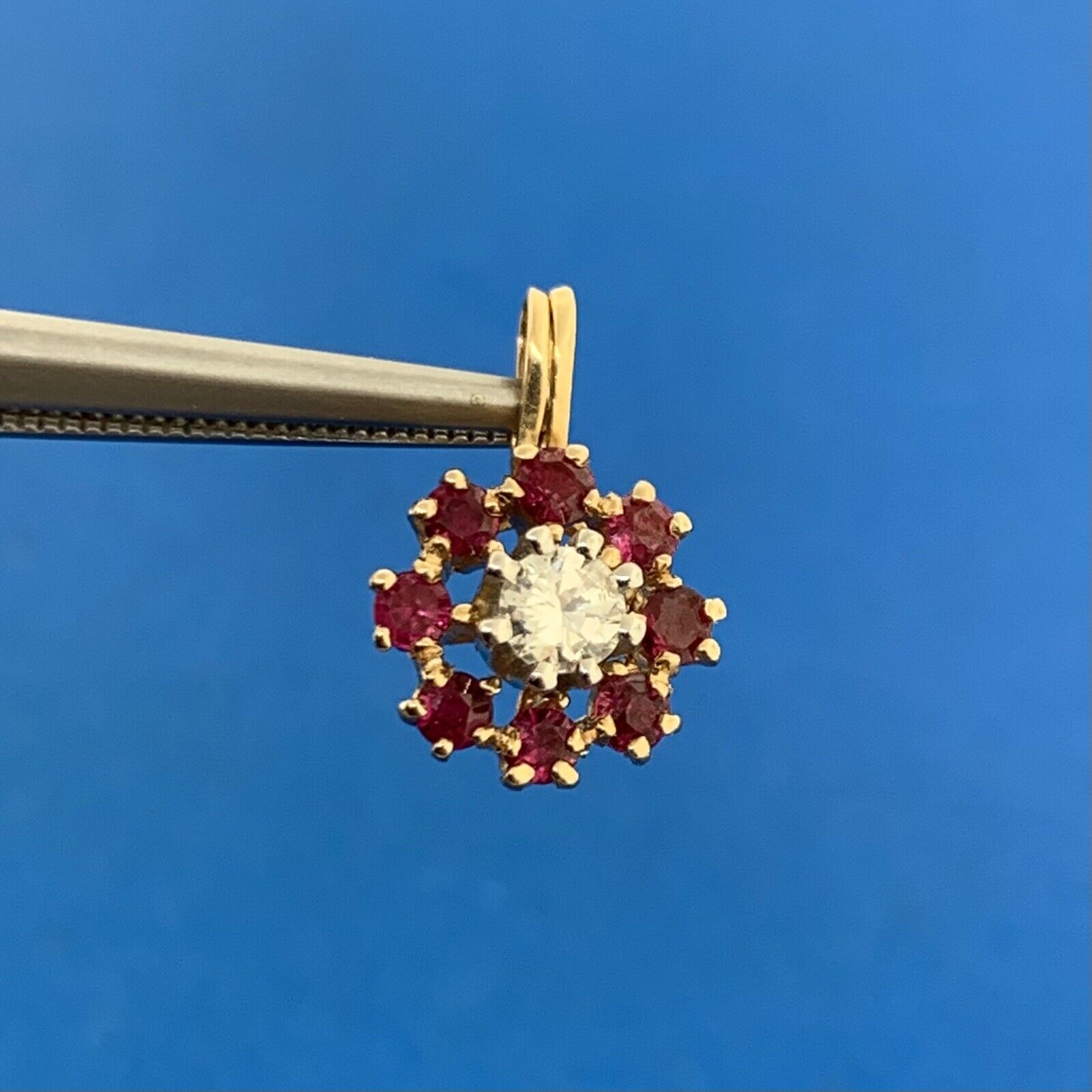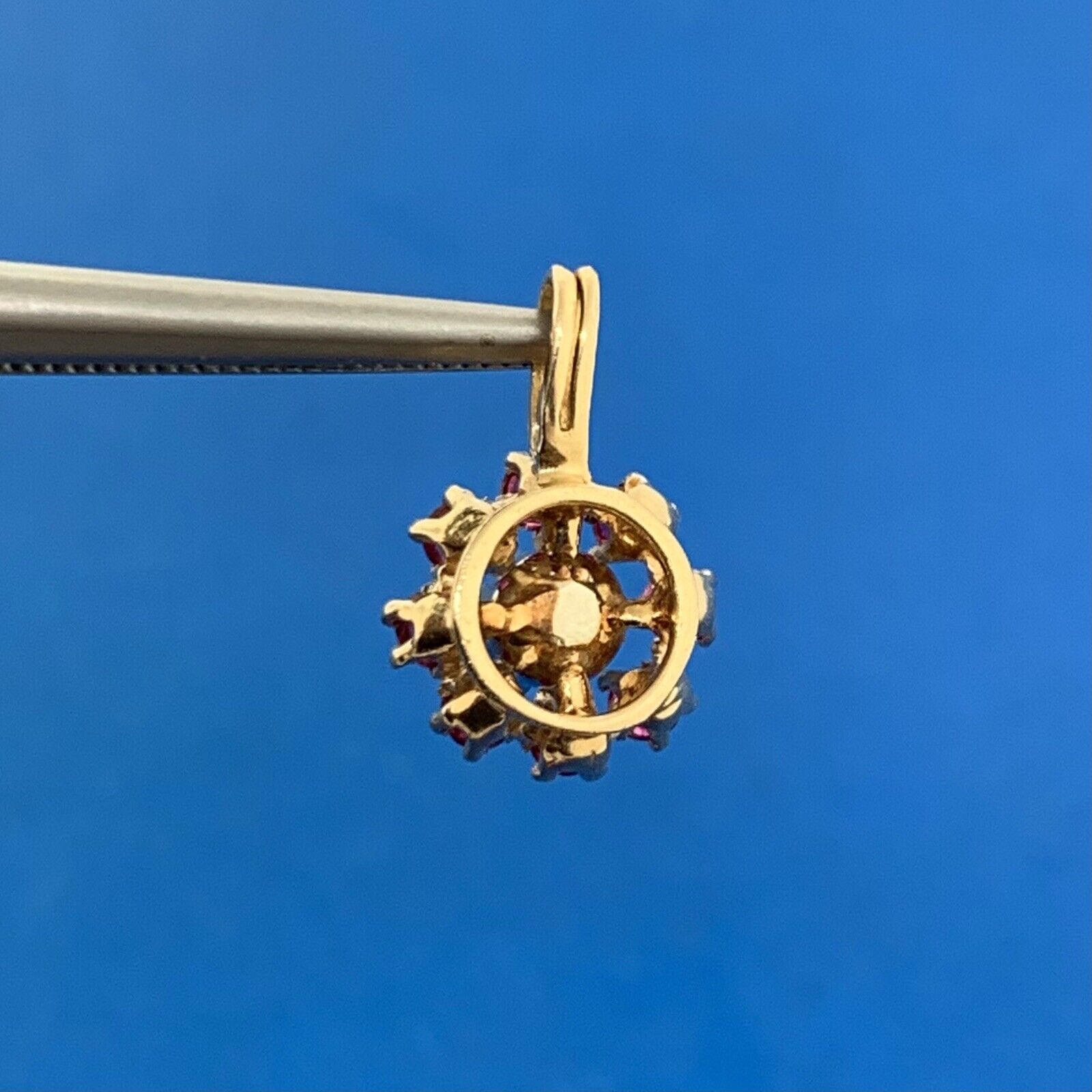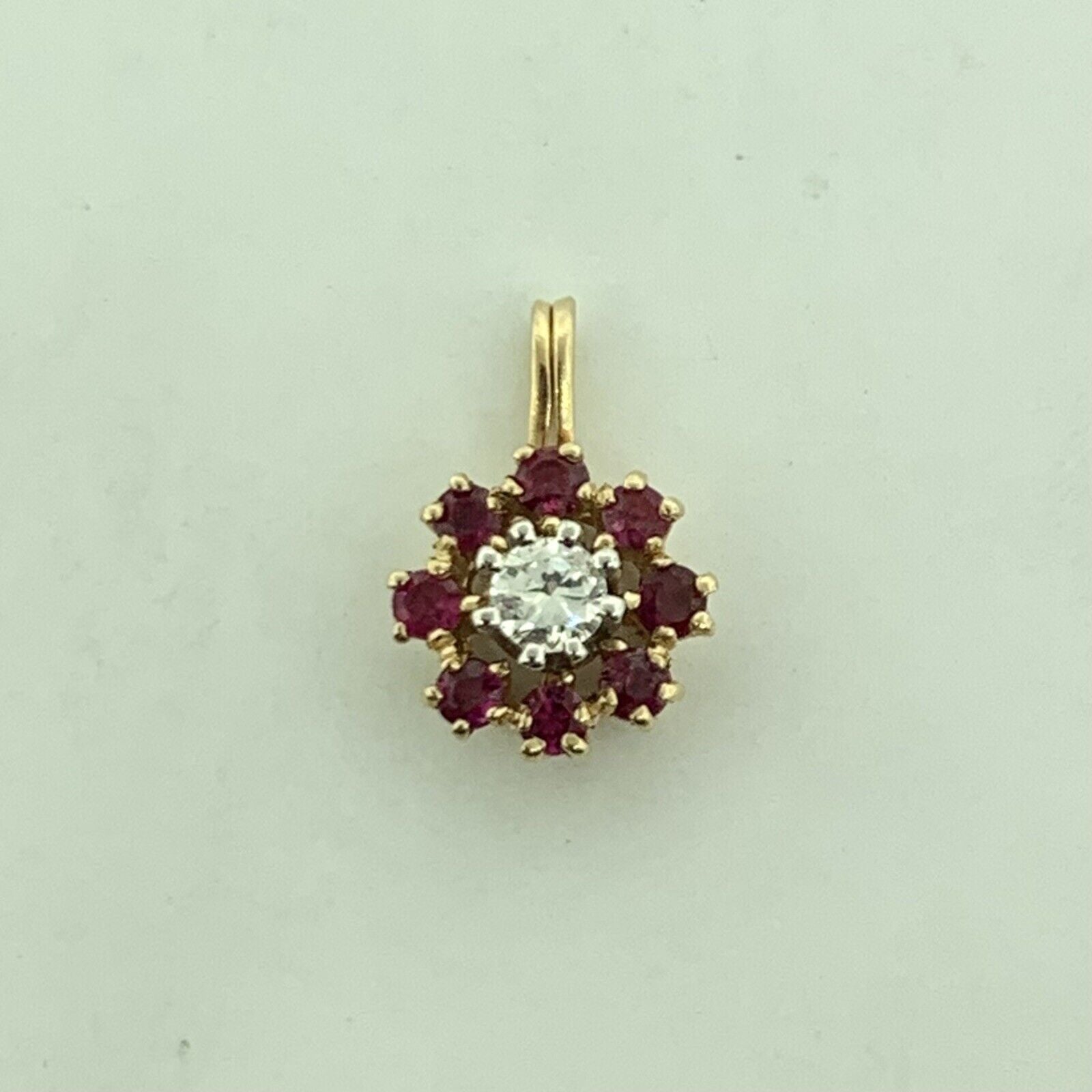 14K Yellow Gold Diamond Ruby Halo Flower Drop Pendant