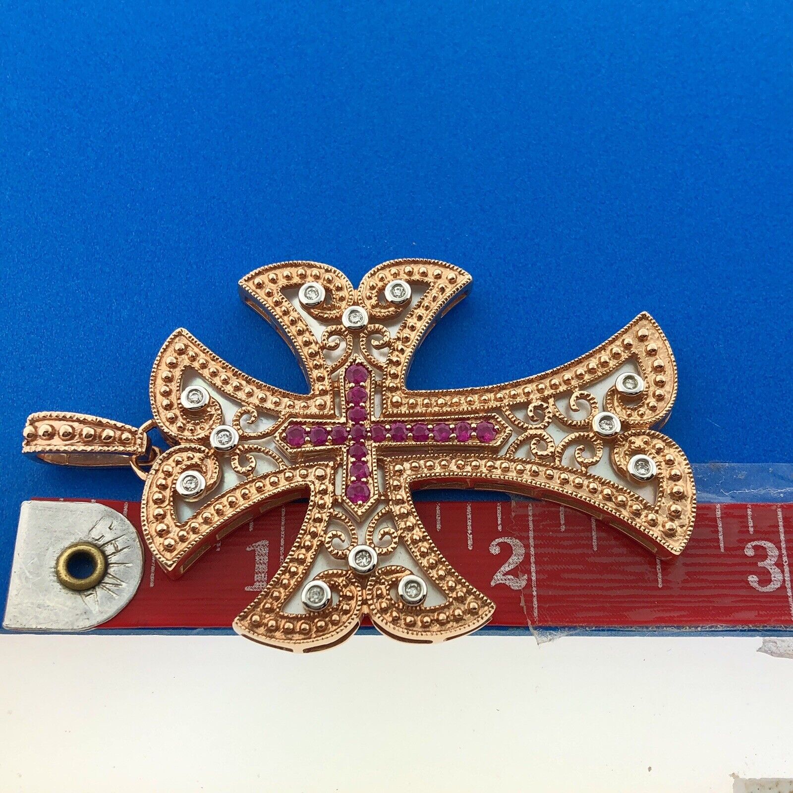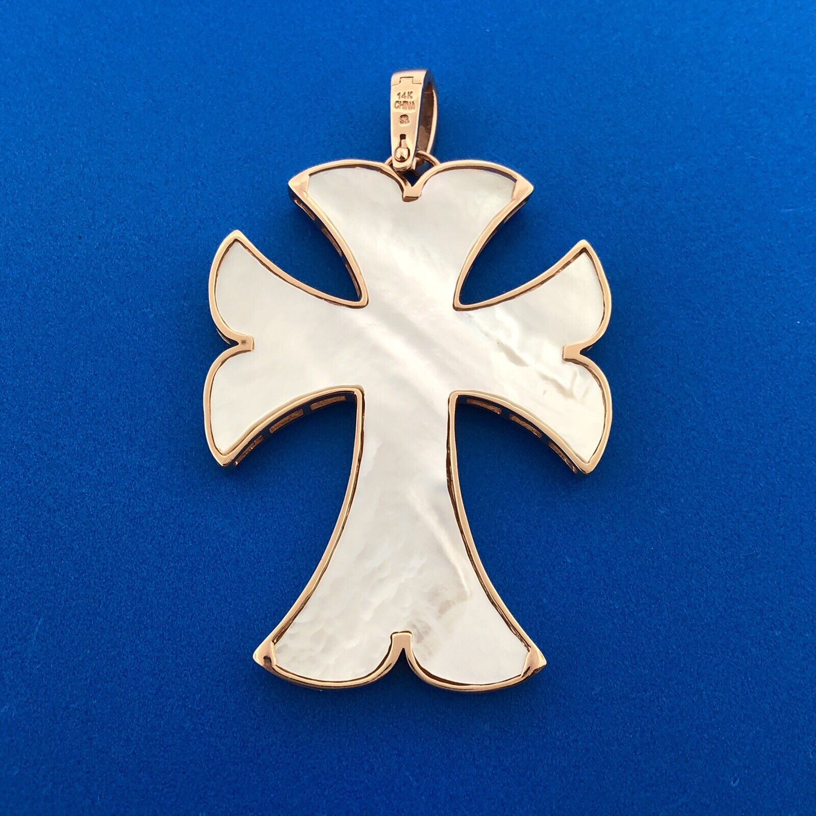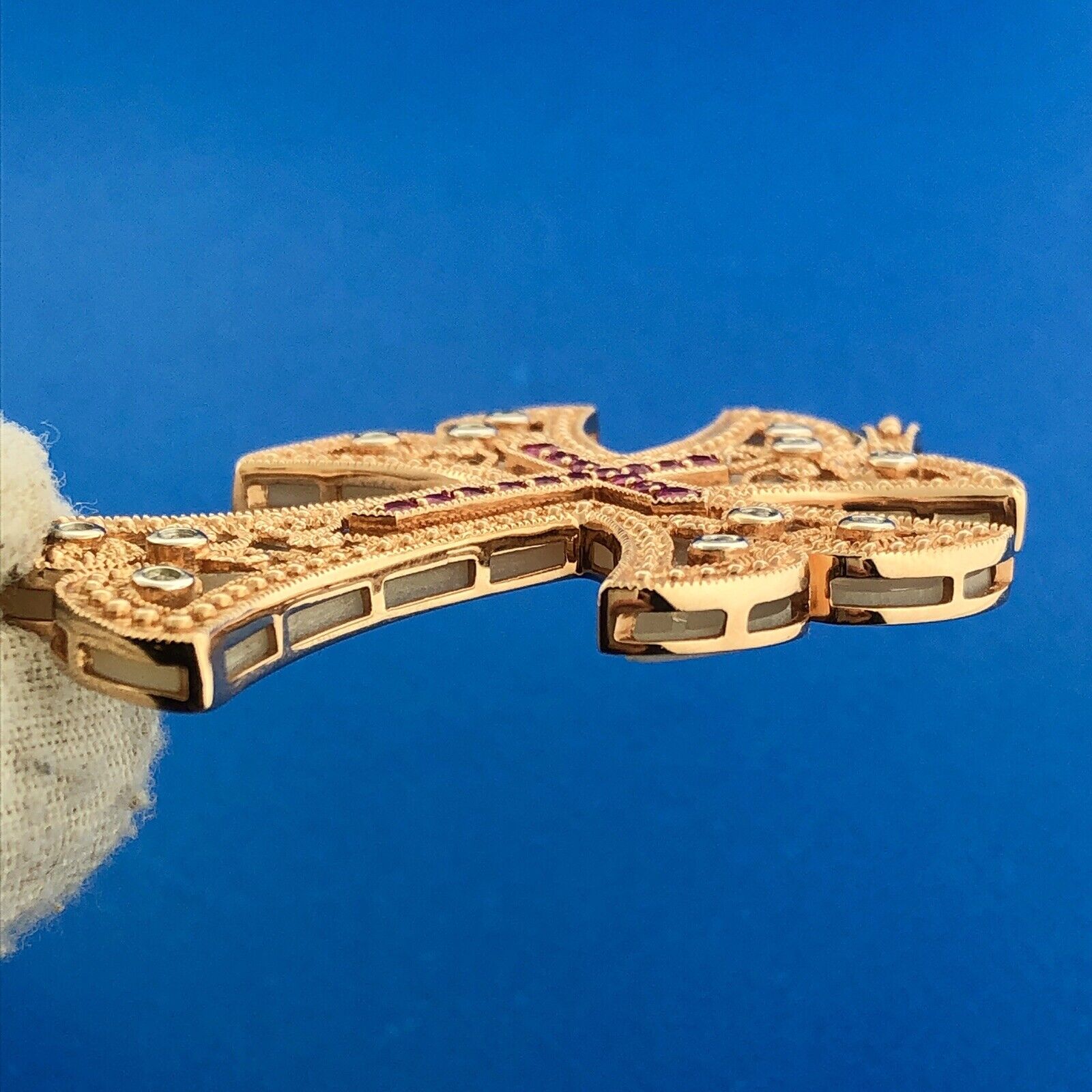 - SR 14k Yellow Gold Diamond Ruby Mother of Pearl Filigree Cross Dangle Pendant