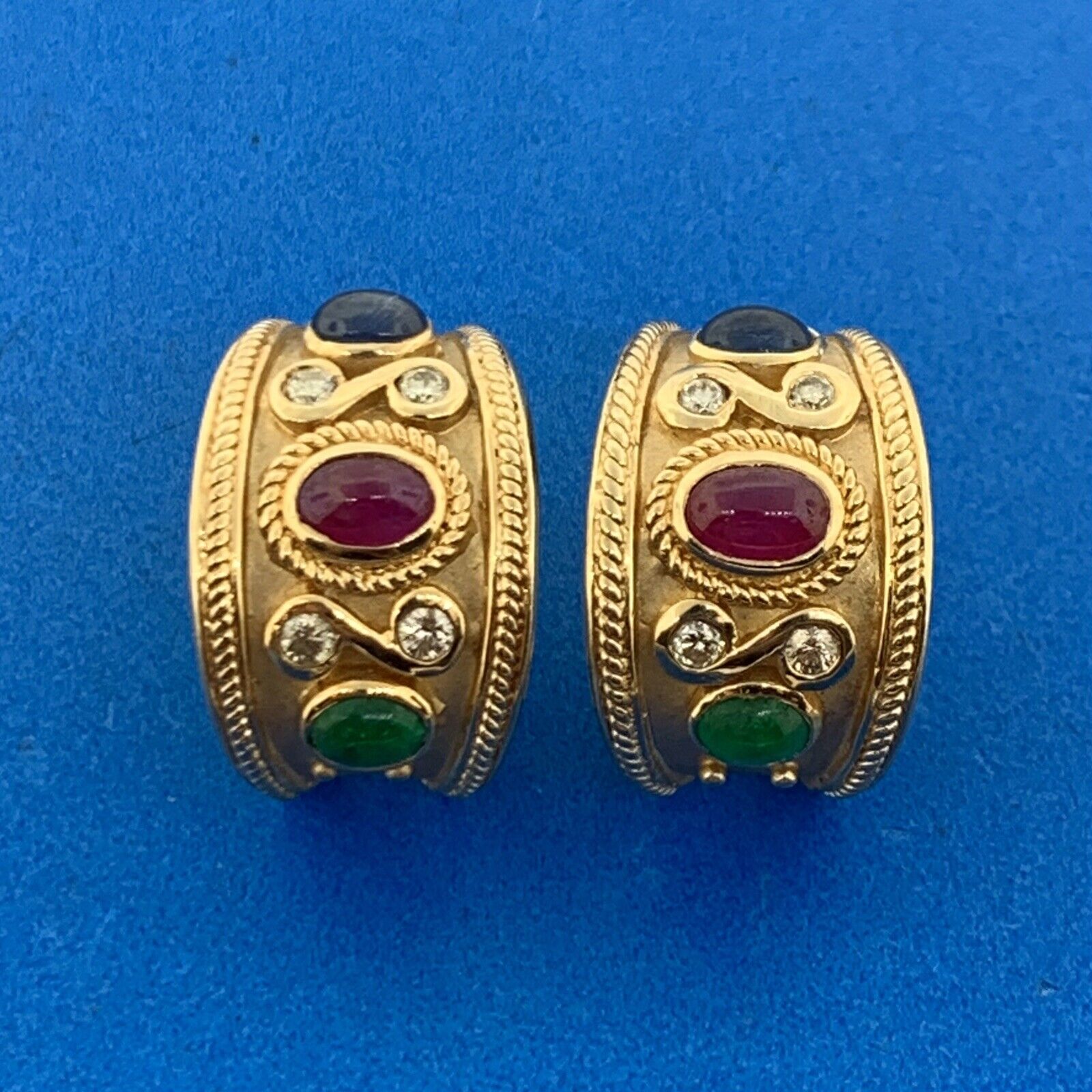- 14K Yellow Gold Ruby Sapphire Emerald Diamond Statement Omega Back Earrings