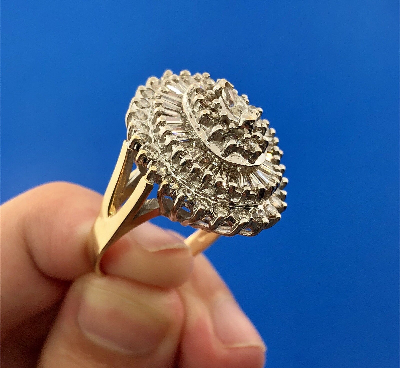 14K Yellow White Gold Diamond Halo Cluster 4 Tier Statement Cocktail Ring