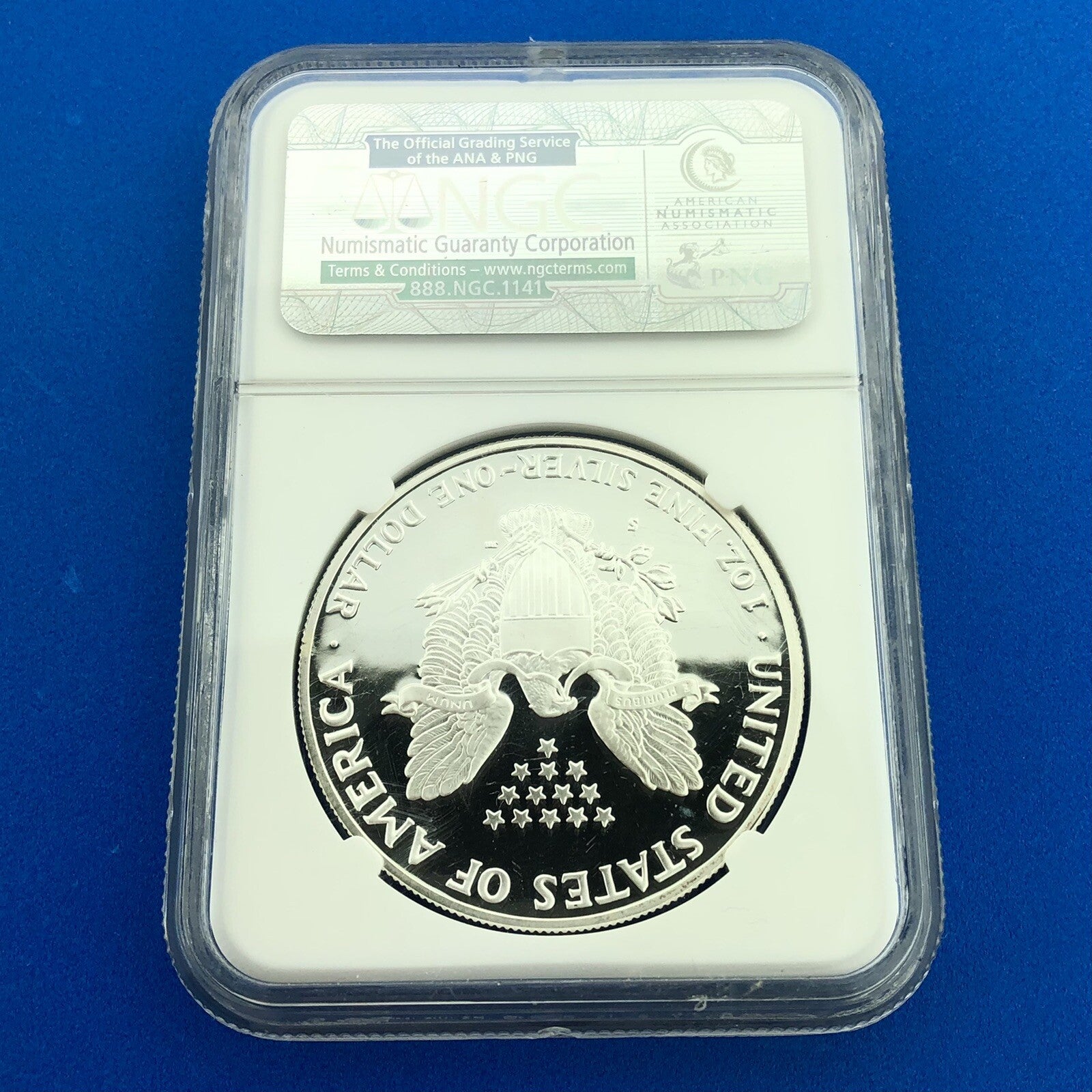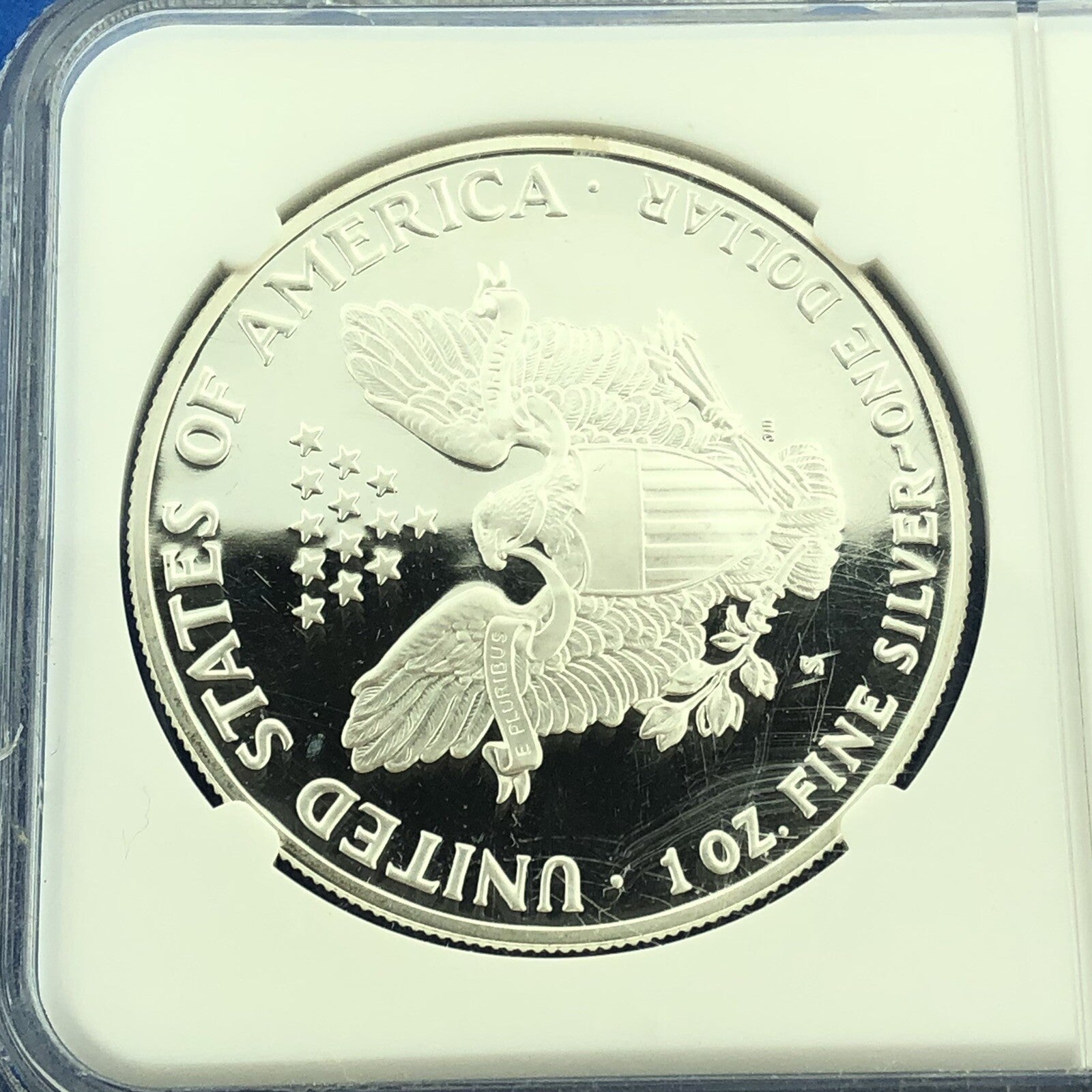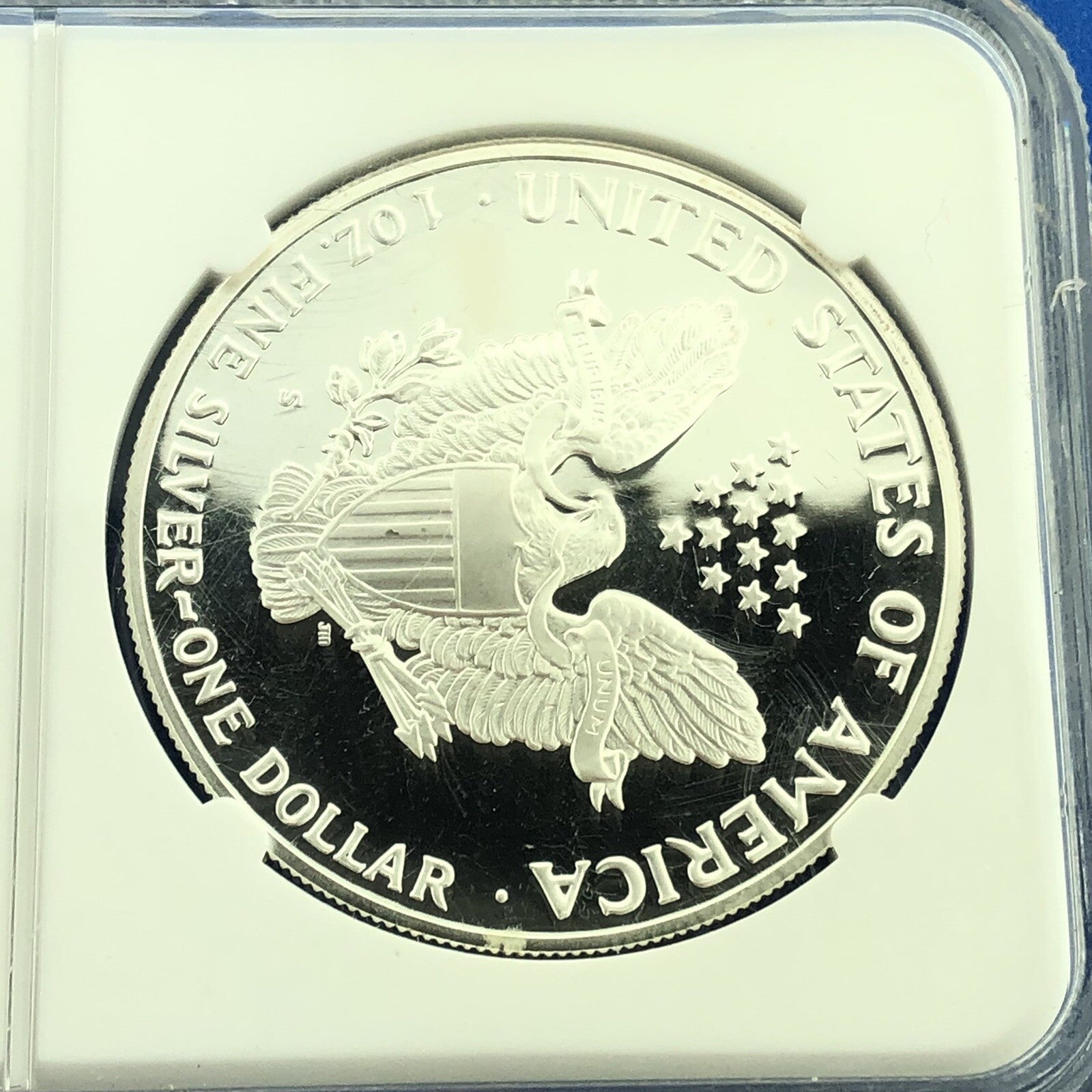 - Reverse reads: UNITED STATES OF AMERICA * E PLURIBUS UNUM * S * 1 OZ. FINE SILVER * ONE DOLLAR