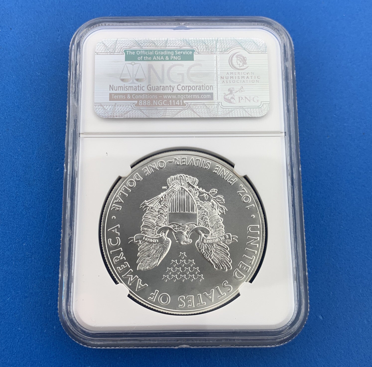 - Reverse reads: UNITED STATES OF AMERICA * E PLURIBUS UNUM * 1 OZ. FINE SILVER * ONE DOLLAR