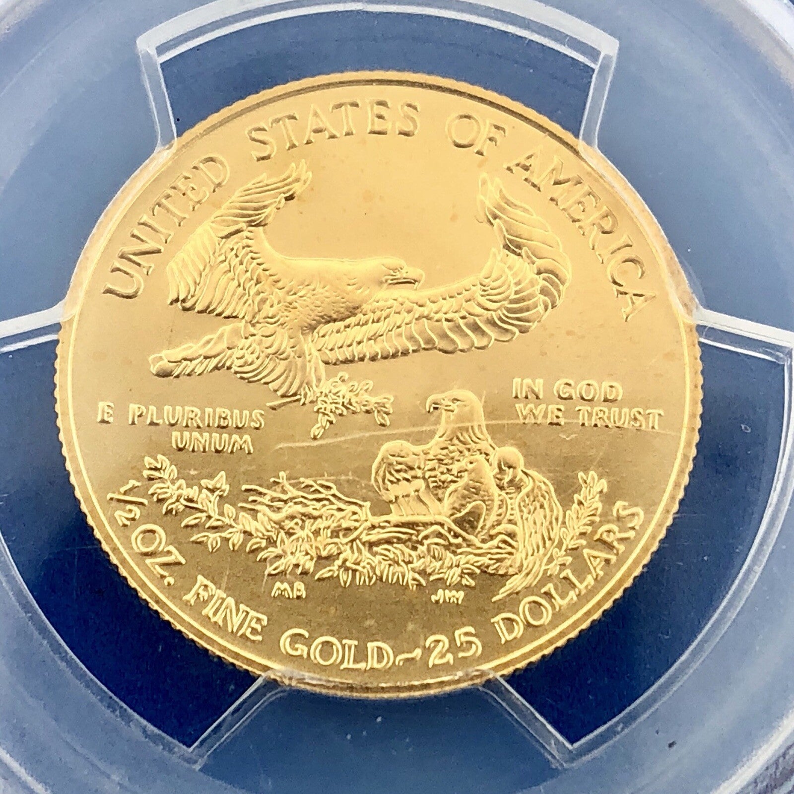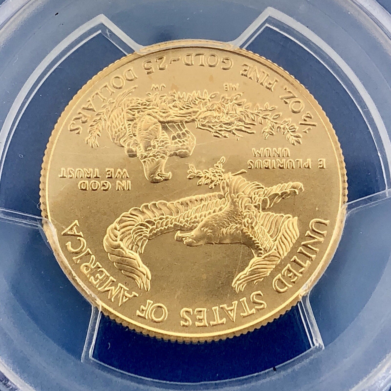 - Reverse reads: UNITED STATES OF AMERICA*E Pluribus Unum*In God We Trust*1/2 OZ Fine Gold*25 Dollars