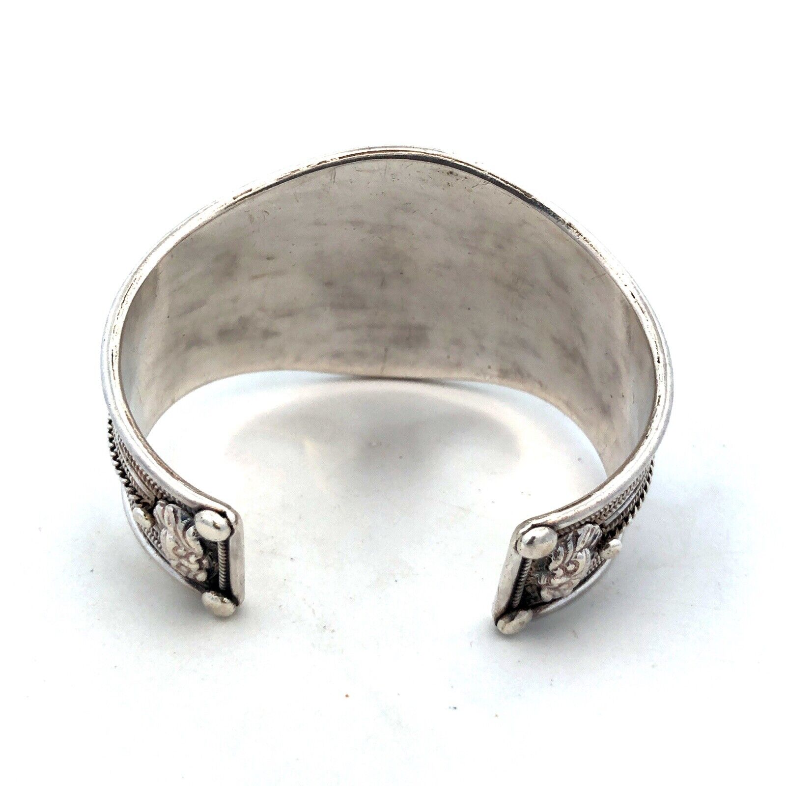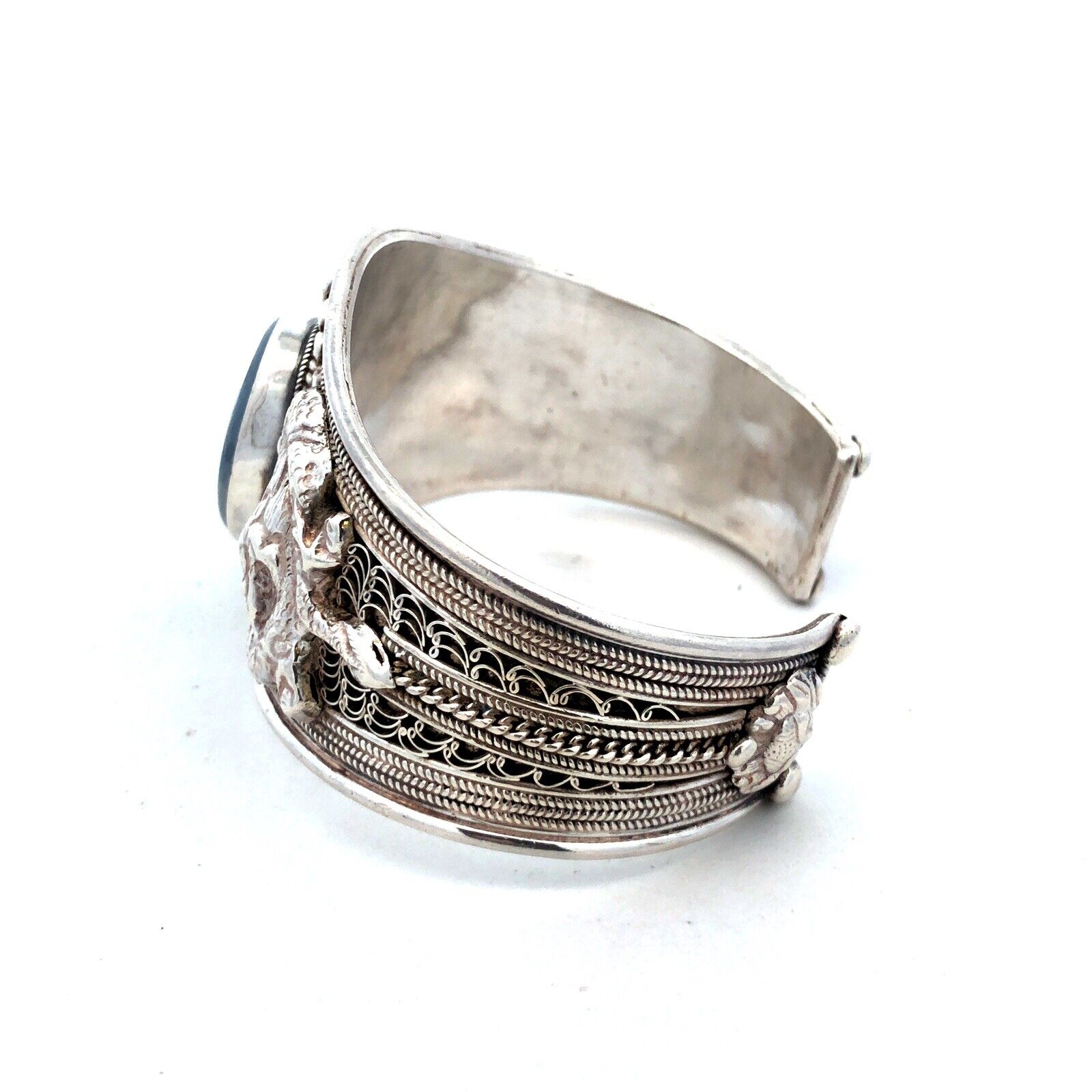 925 Sterling Silver Blue Opal Dragon Filigree Detailed Wide Cuff Bracelet