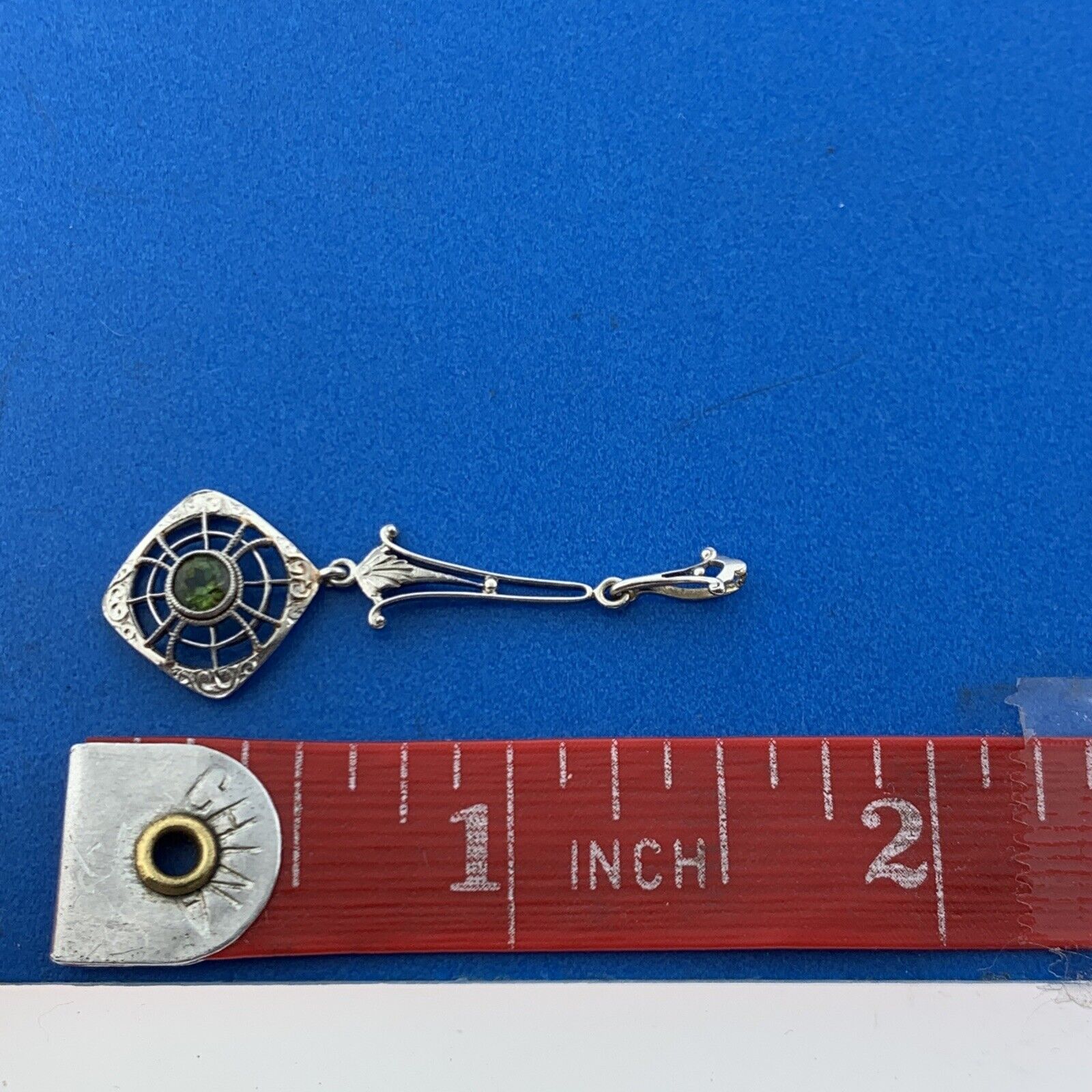 - Art Deco 14K White Gold Peridot August Anniversary Filigree Scroll Drop Pendant