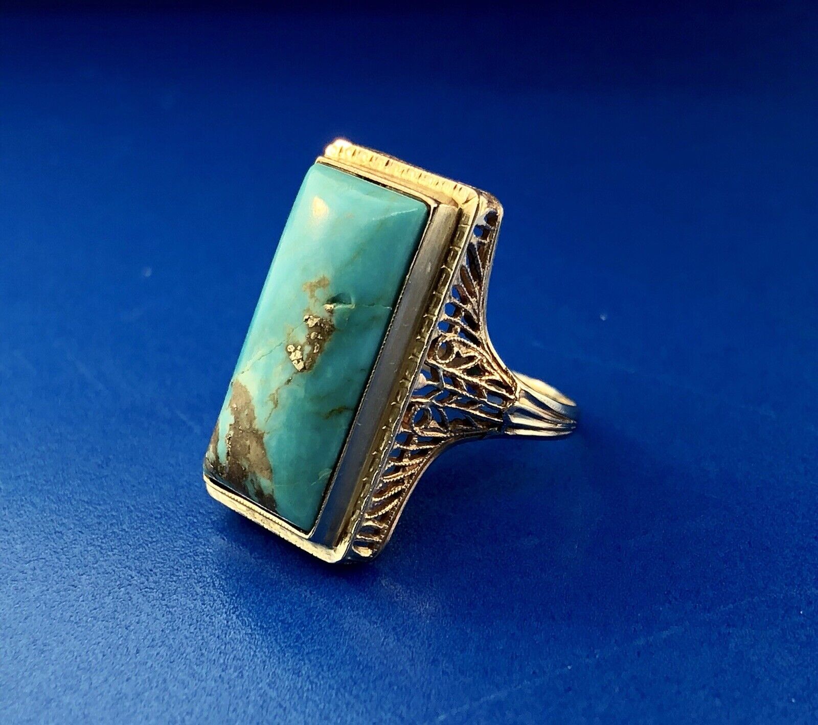 - Art Deco Designer G & Co 14K White Gold Turquoise Filigree Statement Dinner Ring