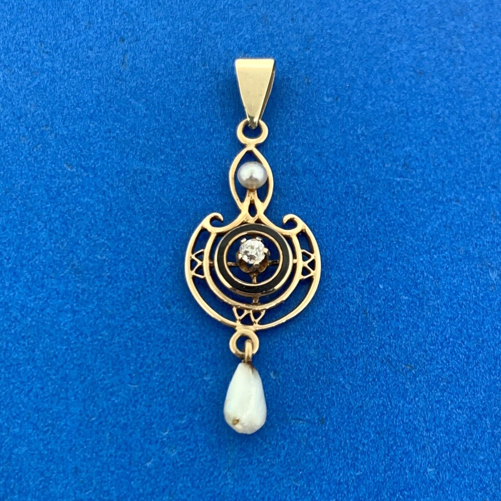Art Nouveau 10K Yellow Gold Diamond Pearl Black Enamel Drop Dangle Pendant