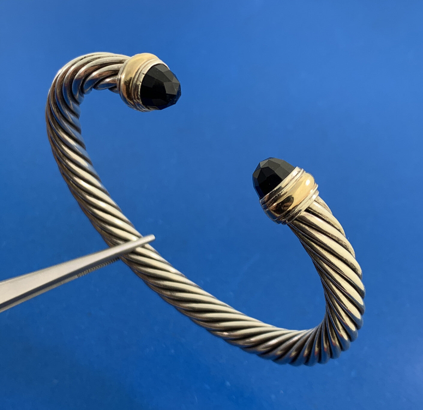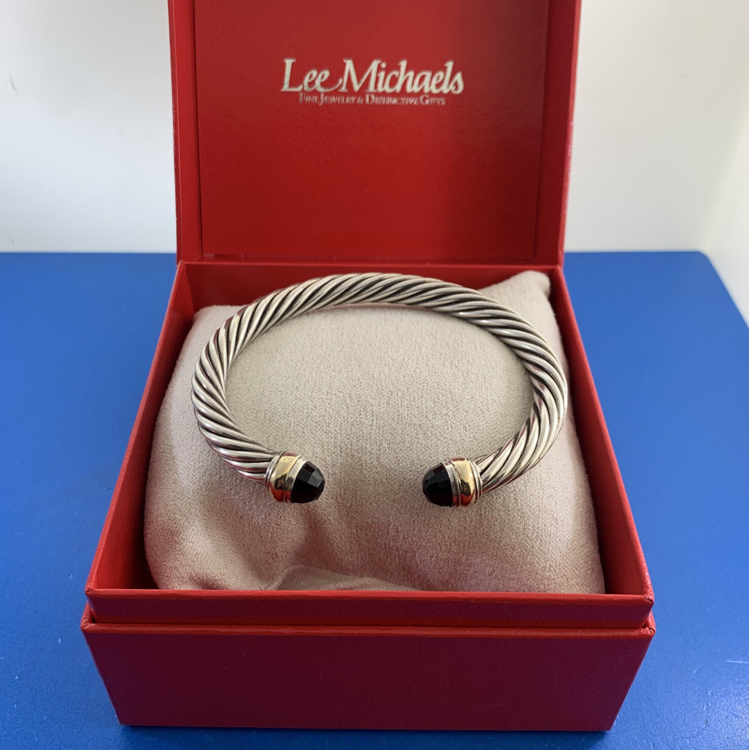 - David Yurman 925 Sterling Silver 14K Gold Onyx Cable Classics Open Cuff Bracelet