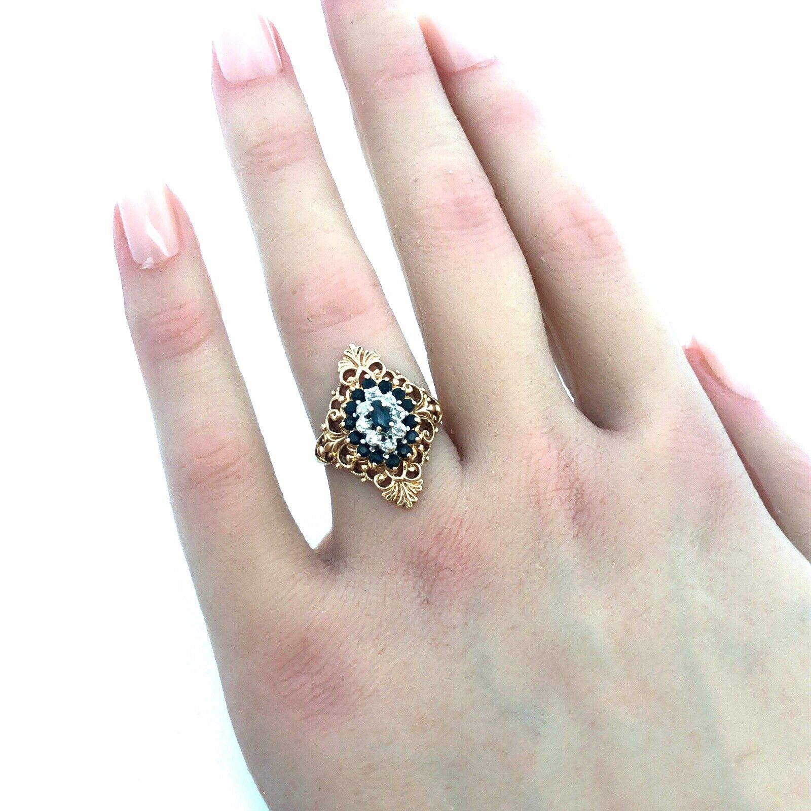 - Designer 10K Yellow Gold Blue Sapphire Diamond Sapphire Accent Cocktail Ring