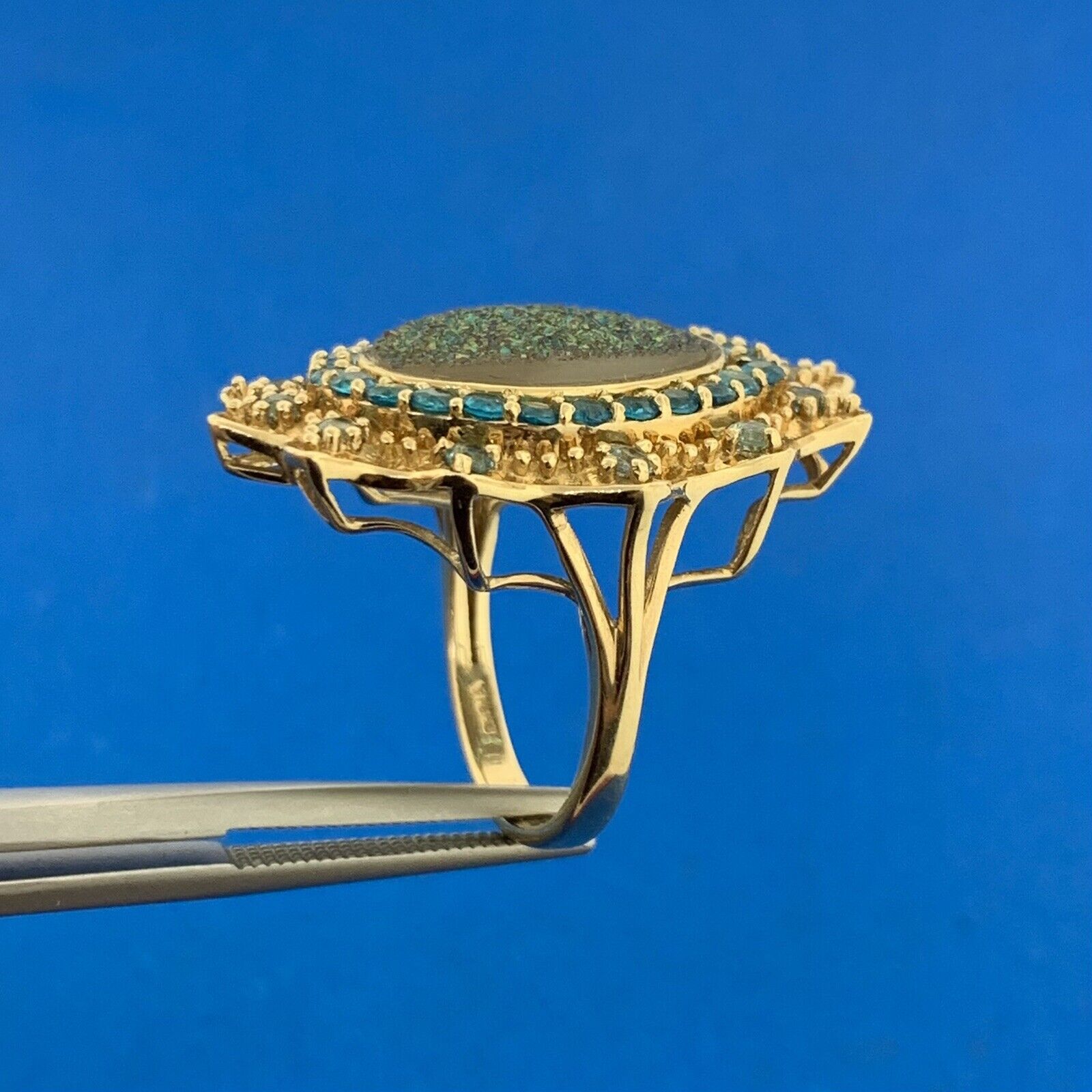 Designer 10K Yellow Gold Drusy Quartz Aquamarine CZ Statement Finger Ring