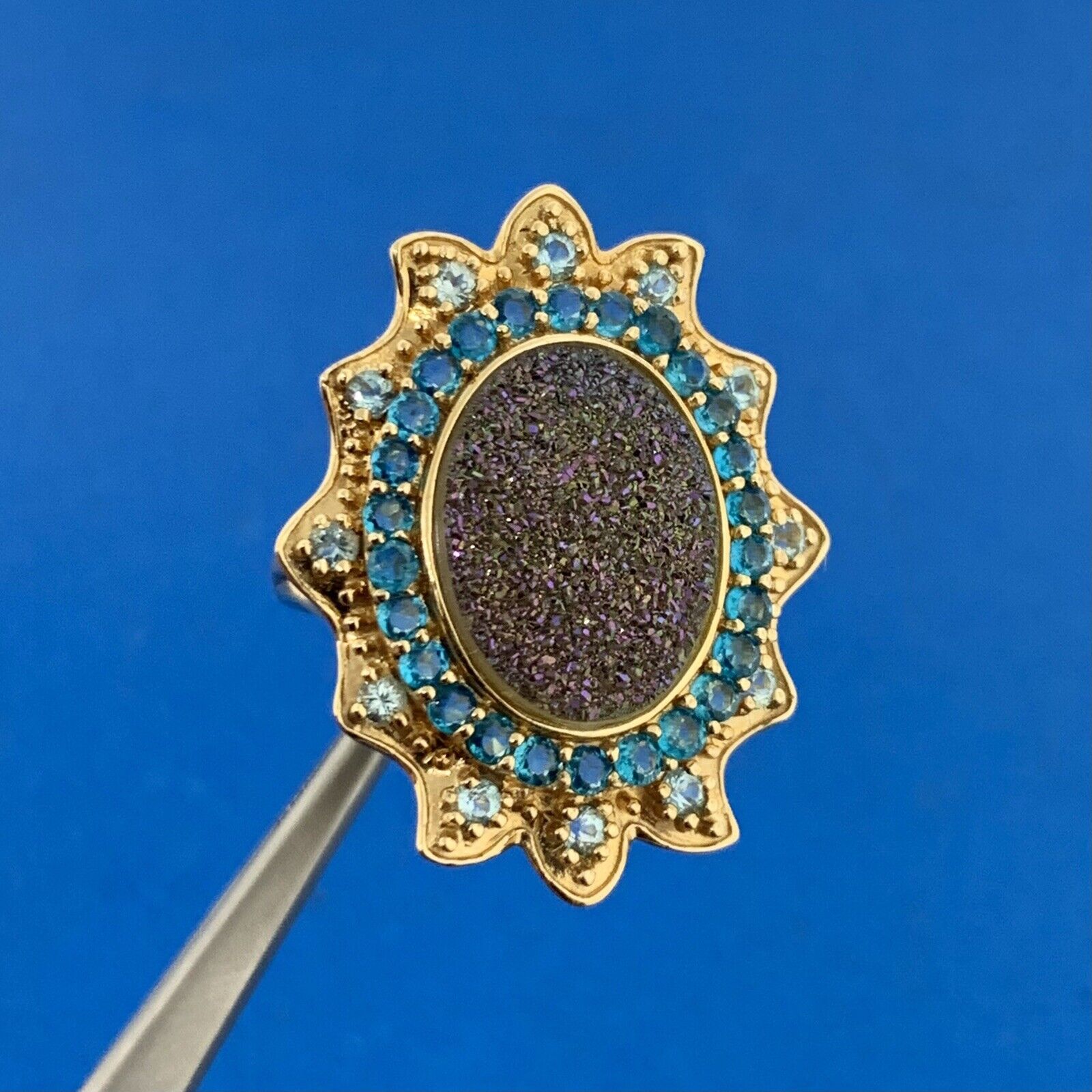 - Designer 10K Yellow Gold Drusy Quartz Aquamarine CZ Statement Finger Ring