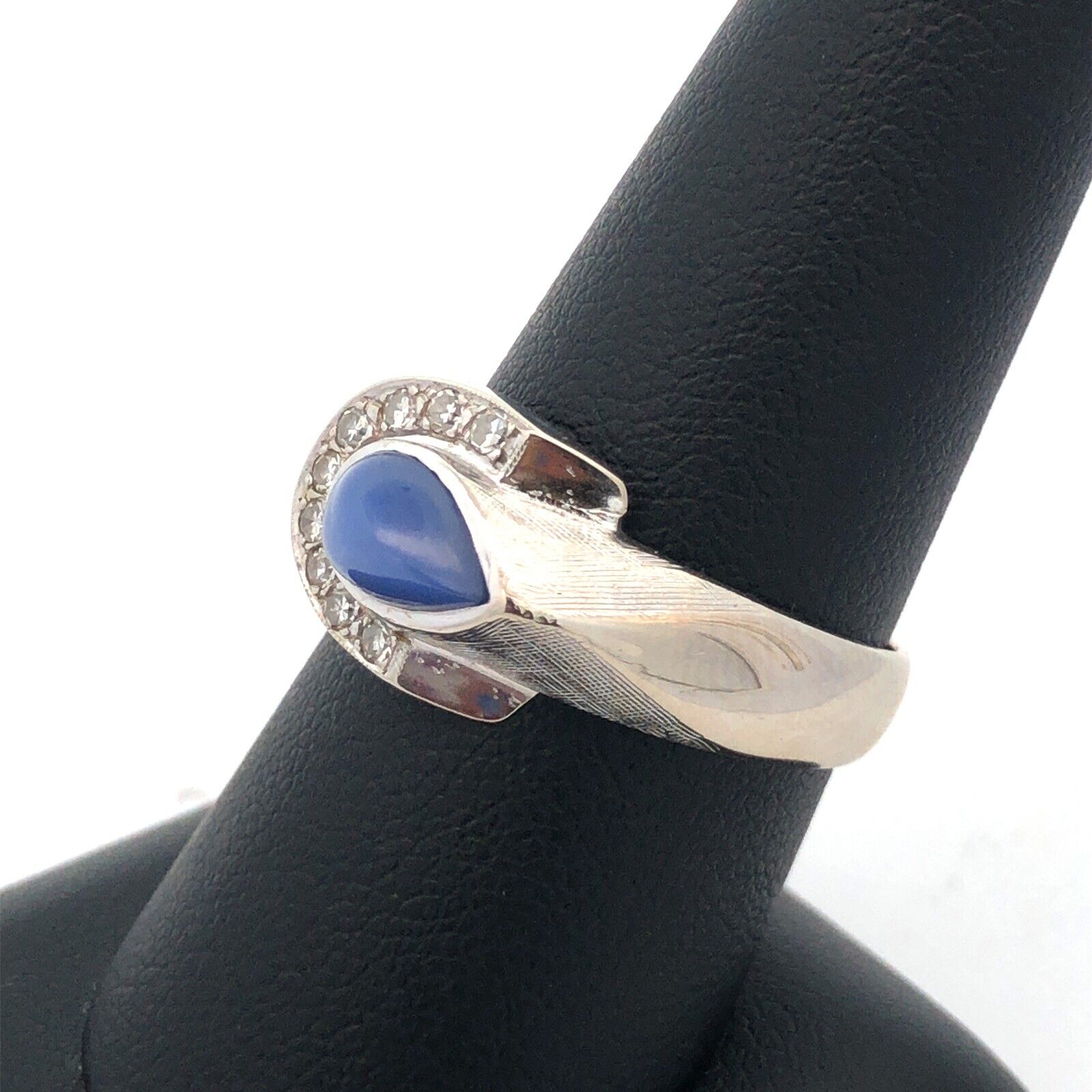 - Designer 14K White Gold Blue Star Sapphire Diamond Accented Modernist Ring