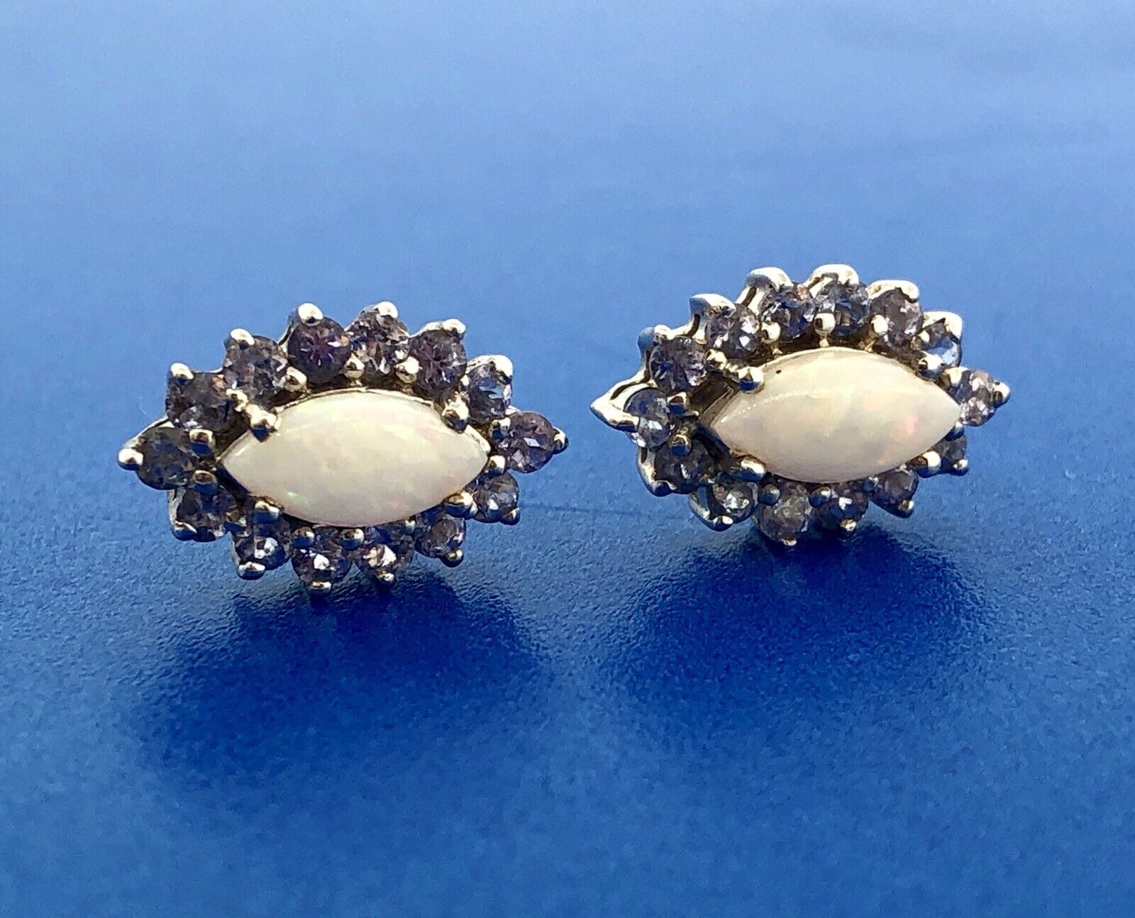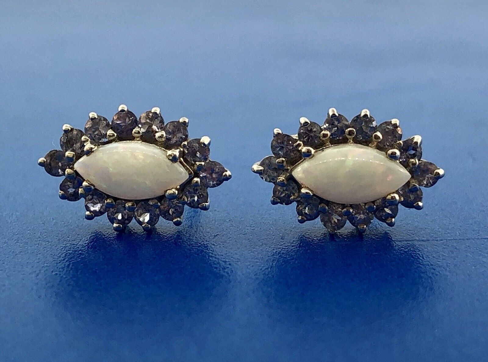 - Designer 14K White Gold Marquise Opal Tanzanite Halo October Stud Earrings
