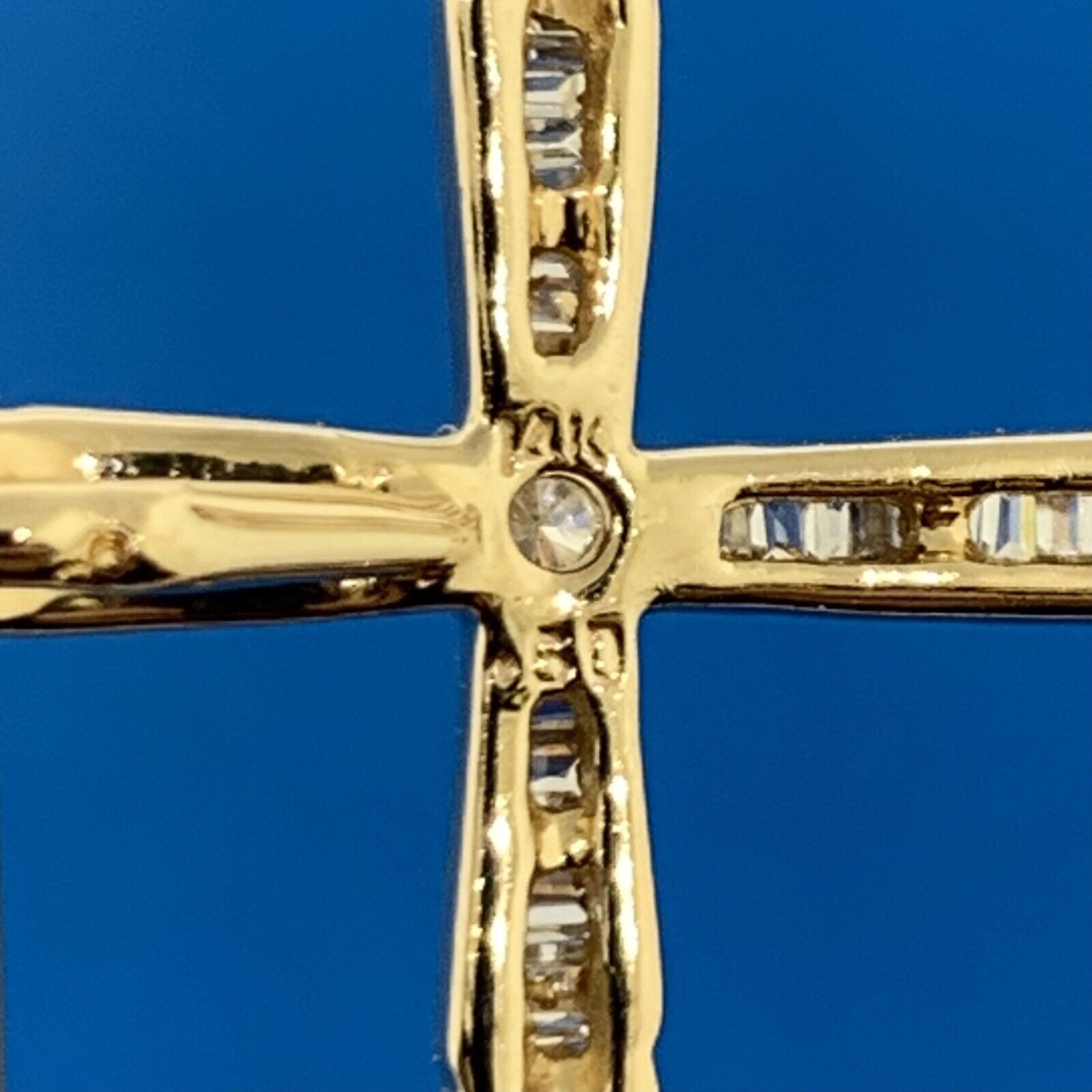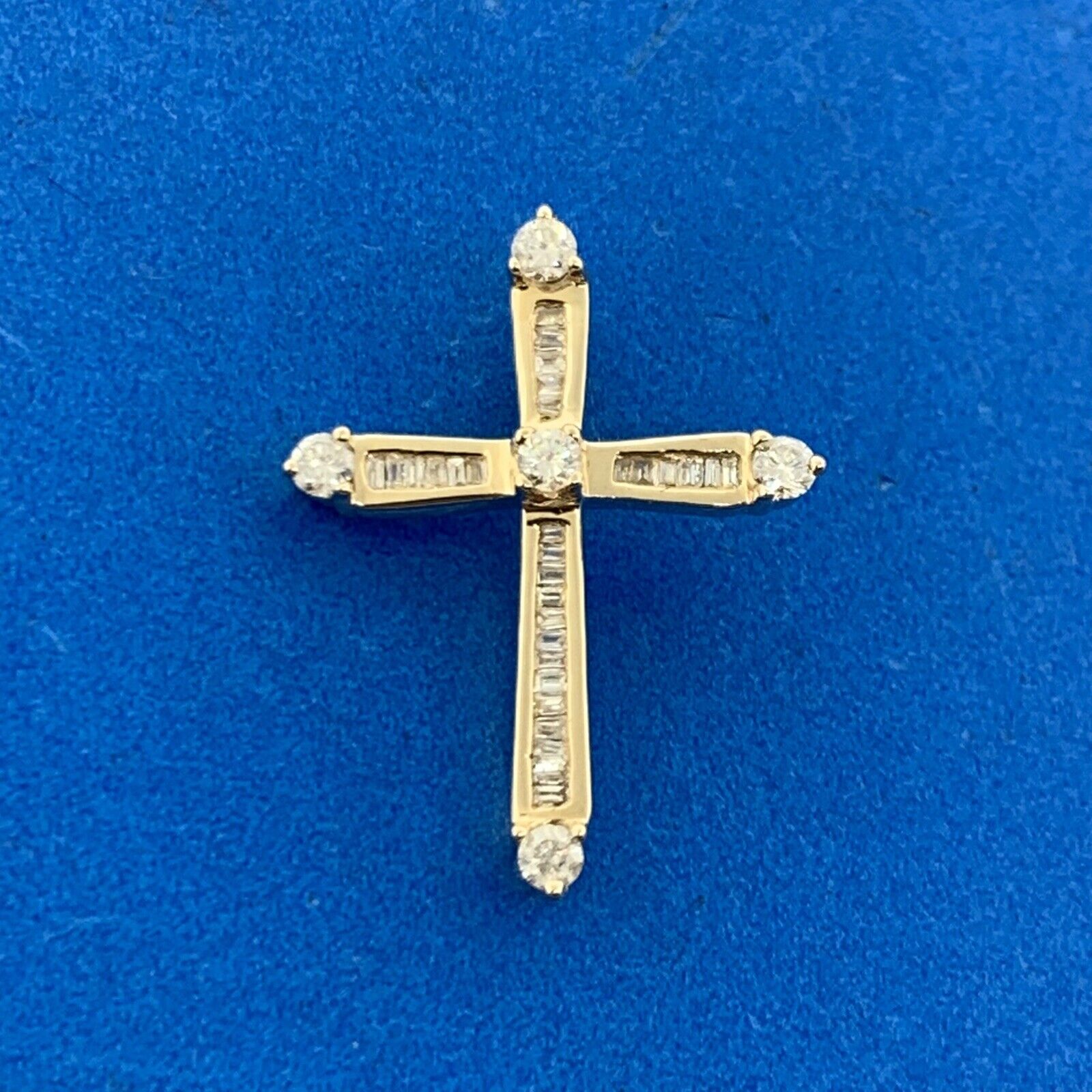 - Designer 14K Yellow Gold Round And Baguette Diamond Cross Pendant