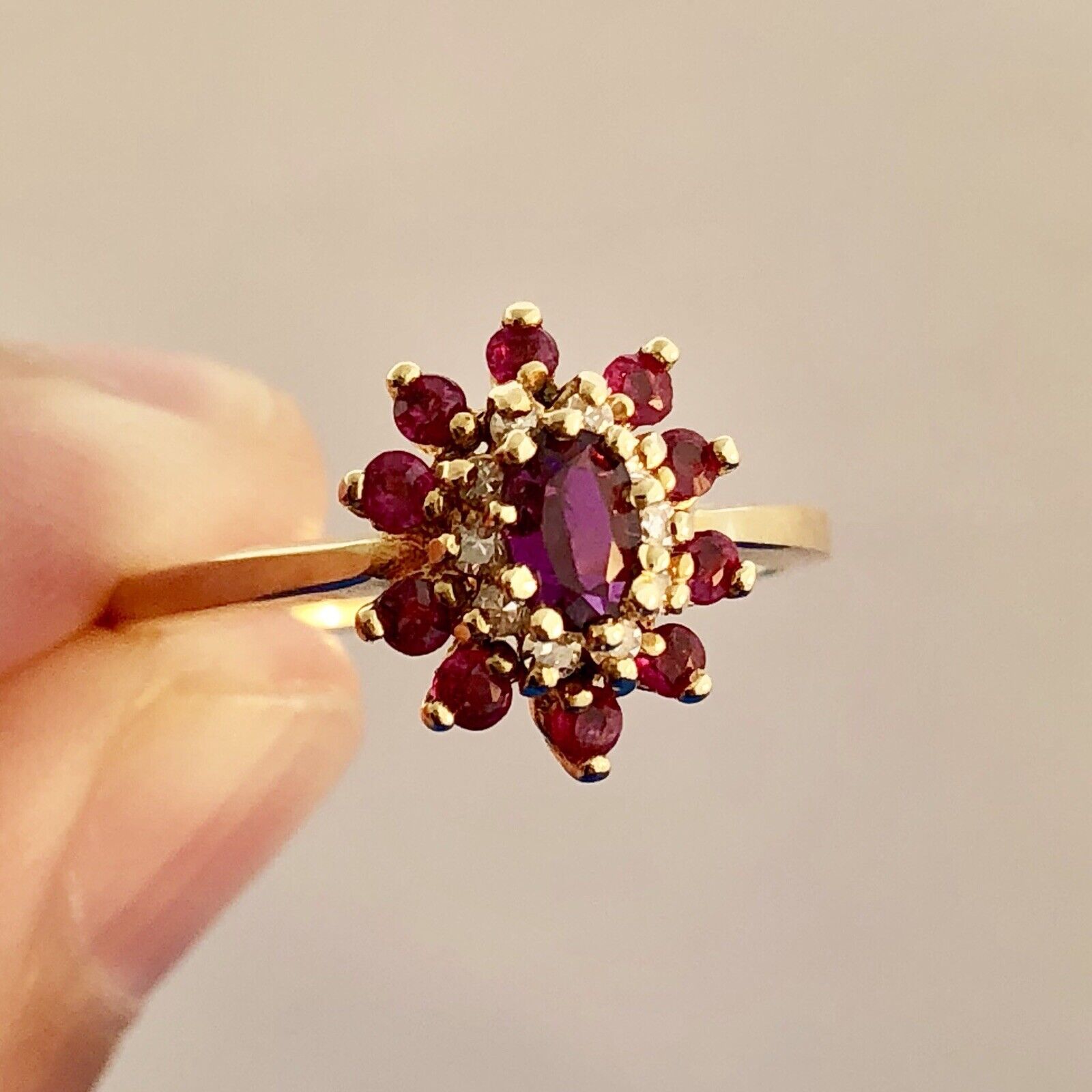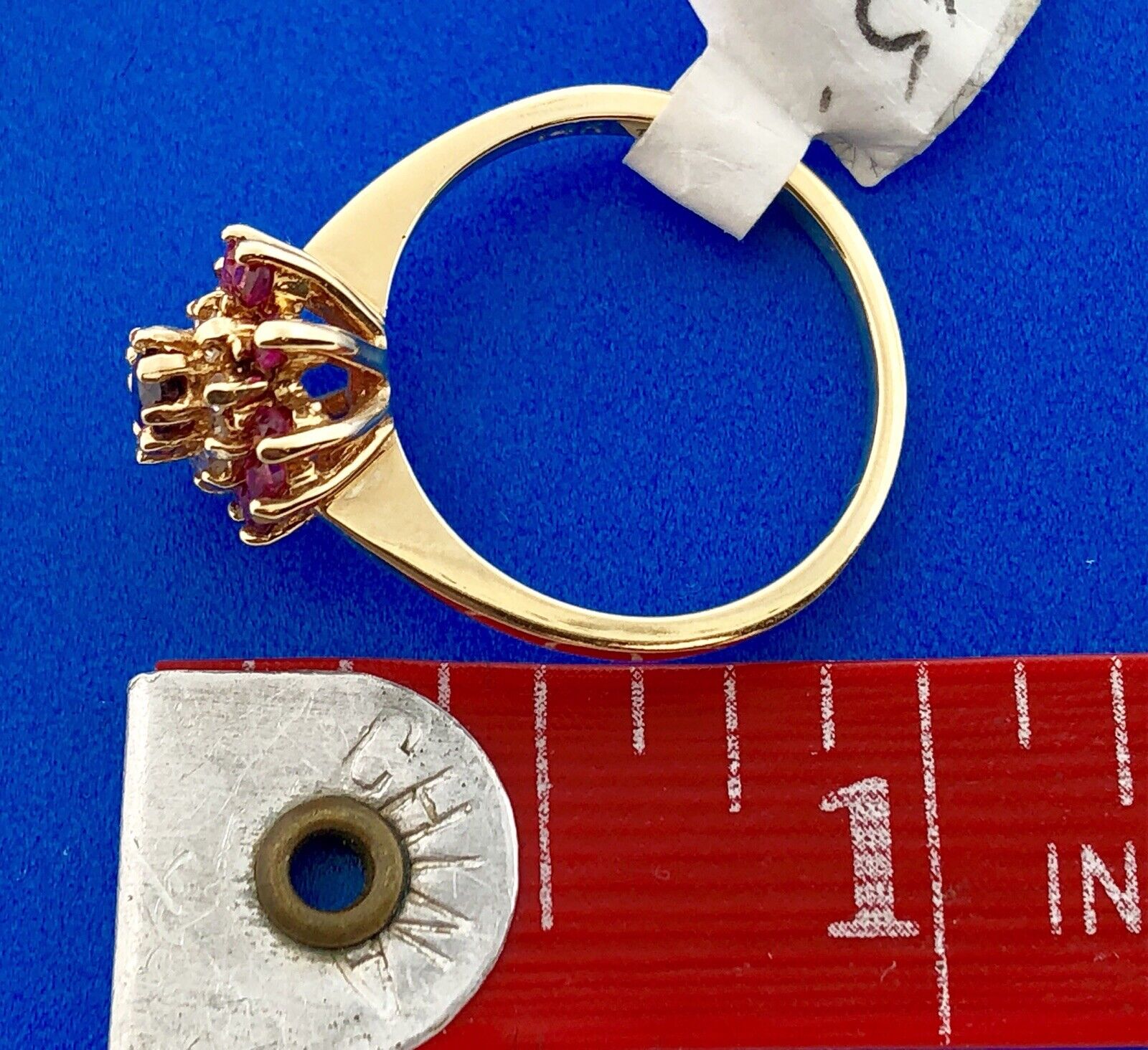 - Designer 14K Yellow Gold Ruby Diamond 3 Tier Cluster Engagement Cocktail Ring