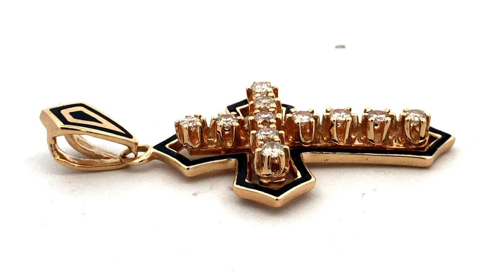 - Estate 14K Yellow Gold Round Diamond Black Enamel Statement Cross Pendant