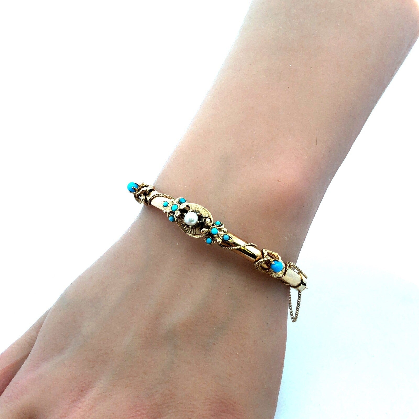 - Estate 14K Yellow Gold Round Turquoise Pearl Art Deco Hinged Bangle Bracelet