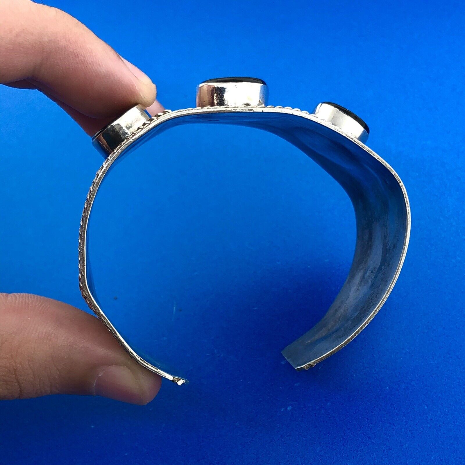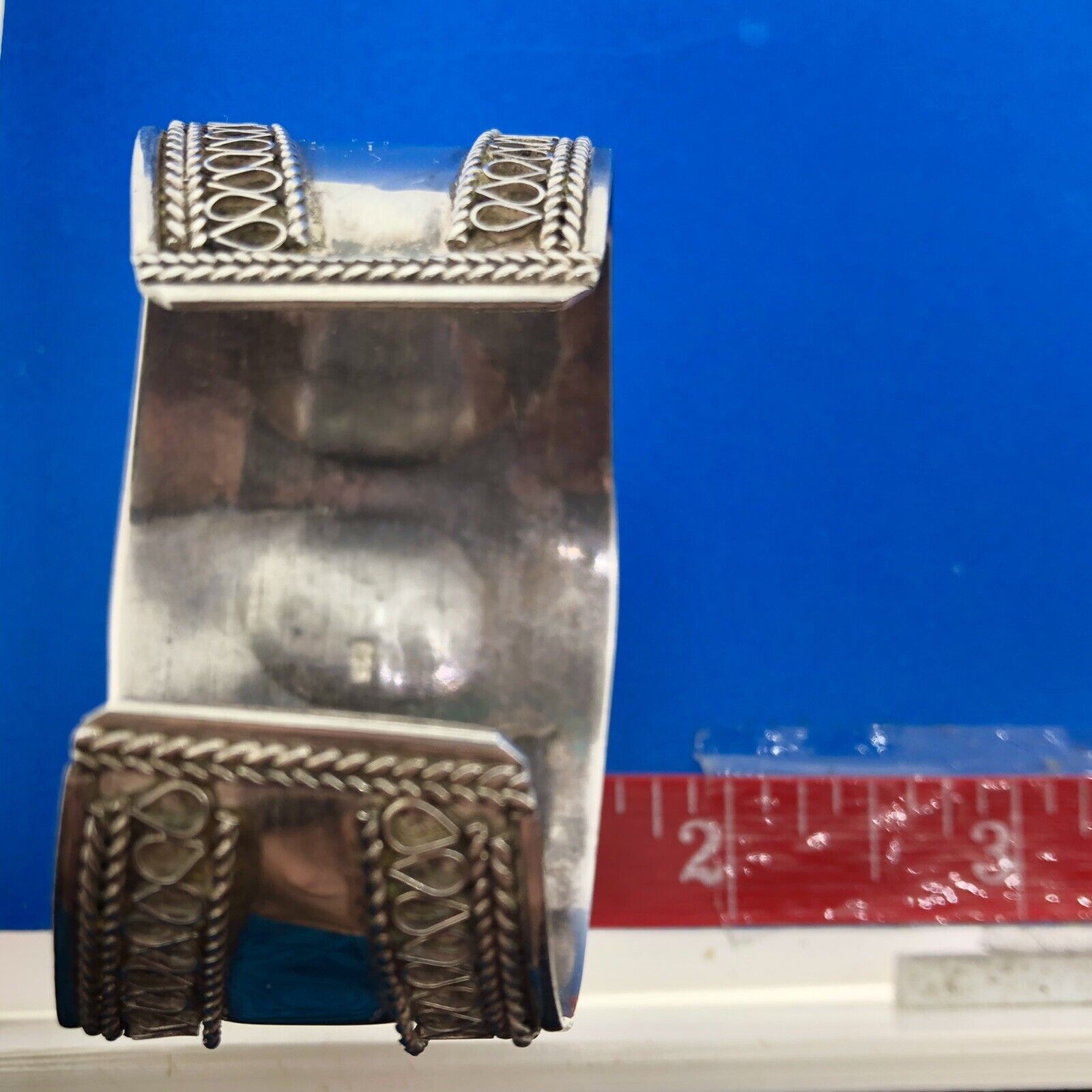- Estate 925 Sterling Silver Black Onyx Cabochon Wheat Scroll Wide Cuff Bracelet
